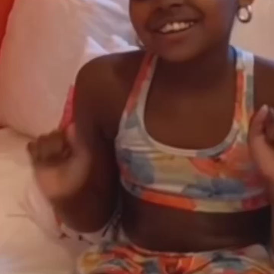 Big, bright florals from Lacquer Baby bloom across this soft two‑piece loungewear set, with a sports‑bra style top and matching elastic‑waist shorts made for easy, all‑day wear. Perfect for storytime snuggles, after‑school playdates, and cozy bedtime rituals that turn into her favorite memories.