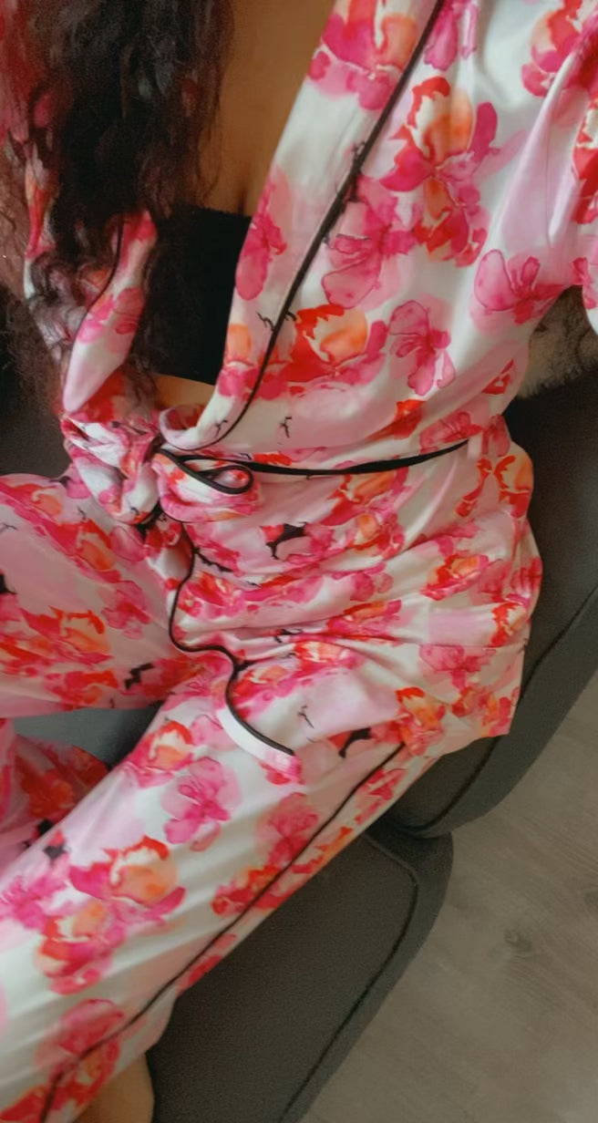 Gold satin skims instead of clings for that cinematic, golden‑hour glow, while the Dreamy Blossom set wraps you in a petal‑soft floral that feels like a boutique hotel suite at home. Both silhouettes are intentionally flattering and polished, designed to photograph beautifully in mirror selfies and cozy couch snaps, and to feel quietly luxurious against your skin whether you’re answering late‑night emails or saying “I’m in for the night.”